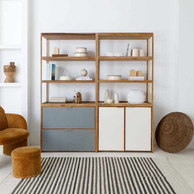 Biblioteca multitodo, súper funcional para poner en infinidad de espacios con 4 estantes + 1 cajón entelados en gasa 100% algodón.